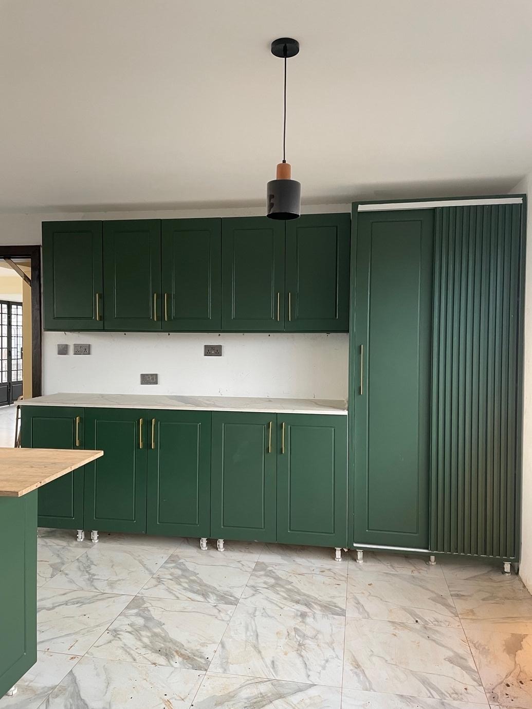 - Deep green cabinetry with gold handles for a bold yet sophisticated aesthetic